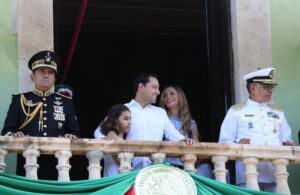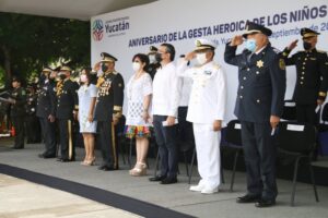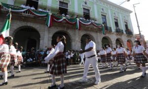 Junto con los yucatecos, Vila Dosal observó los diversos contingentes que participaron en el desfile, como parte de los festejos...