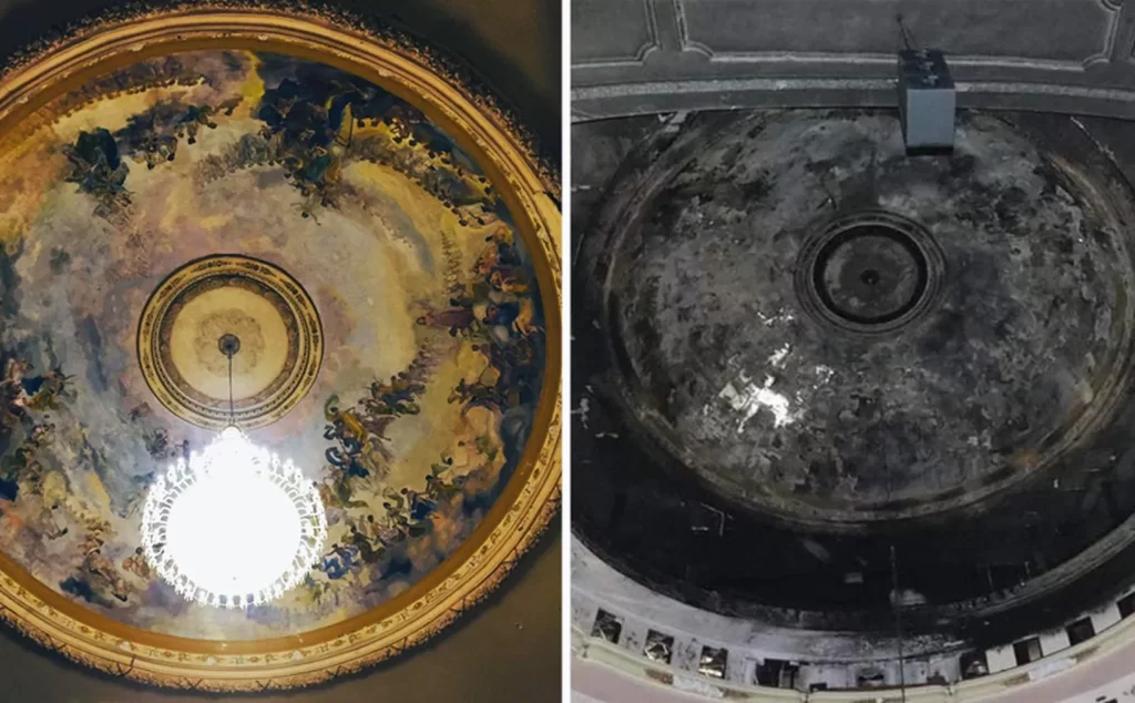 De acuerdo con la revisión de expertos en restauración, el área visiblemente más afectada del teatro es la cúpula y la pintura del mural, con una pérdida de más de 60 por ciento. Los daños de la pintura no sólo afectaron su imagen, también su soporte, de acuerdo con el reporte.