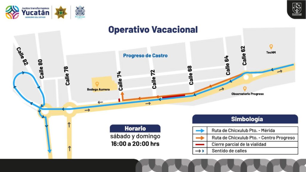 Por su parte, quienes transiten de Chicxulub al Centro de Progreso, cuando lleguen a la glorieta de la calle 62 tomarán la lateral hasta la calle 74 en donde darán vuelta a la derecha.