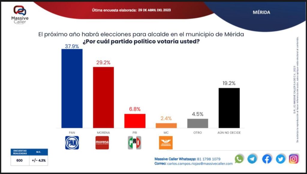 Tanto en Mérida como en Progreso, el PRI aparece en un lejano tercer lugar, con el 6.8 y el 9.2 por ciento de las intenciones del voto, respectivamente, y más lejos aún asoma Movimiento Ciudadano, con el 2.4% de las preferencias en Mérida y el 3.8% en Progreso.