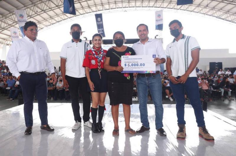 En el Polifuncional San José Tecoh, al sur de la ciudad, Vila Dosal, acompañado de la Gobernadora por un día, Adriana Marilú Gamboa Méndez, distribuyó certificados de educación básica y estímulos a adolescentes que, por diversos motivos, desertaron durante la pandemia y ahora han regresado a continuar su preparatoria.