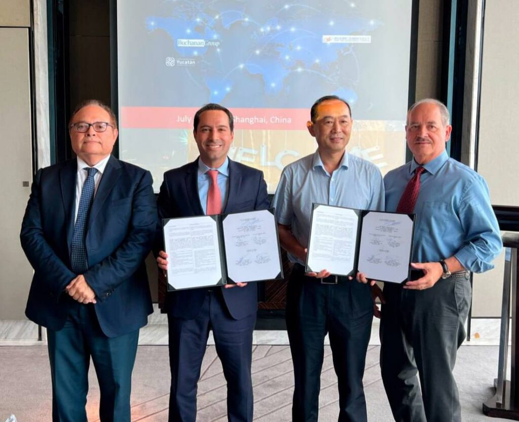 Shanghai, China, 22 de julio de 2023.- La misión comercial que realiza el Gobernador Mauricio Vila Dosal por el gigante asiático para atraer más inversiones al estado que se traduzcan en mayores fuentes de empleos mejor pagados para los yucatecos, rinde frutos, al dar como resultado la firma de una carta intención con las empresas Xinyatong Metal Manufacture y Buchanan Group para el establecimiento de una planta de manufactura en Ticul que podría generar hasta 200 nuevas plazas laborales en Yucatán.