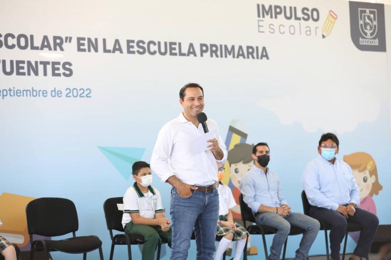 Vila Dosal estuvo en la escuela primaria federal «Julia Ruiz Fuentes», ubicada al poniente de Mérida, distribuyendo estos apoyos que representan para las familias yucatecas un ahorro de 2,850 pesos por cada estudiante.