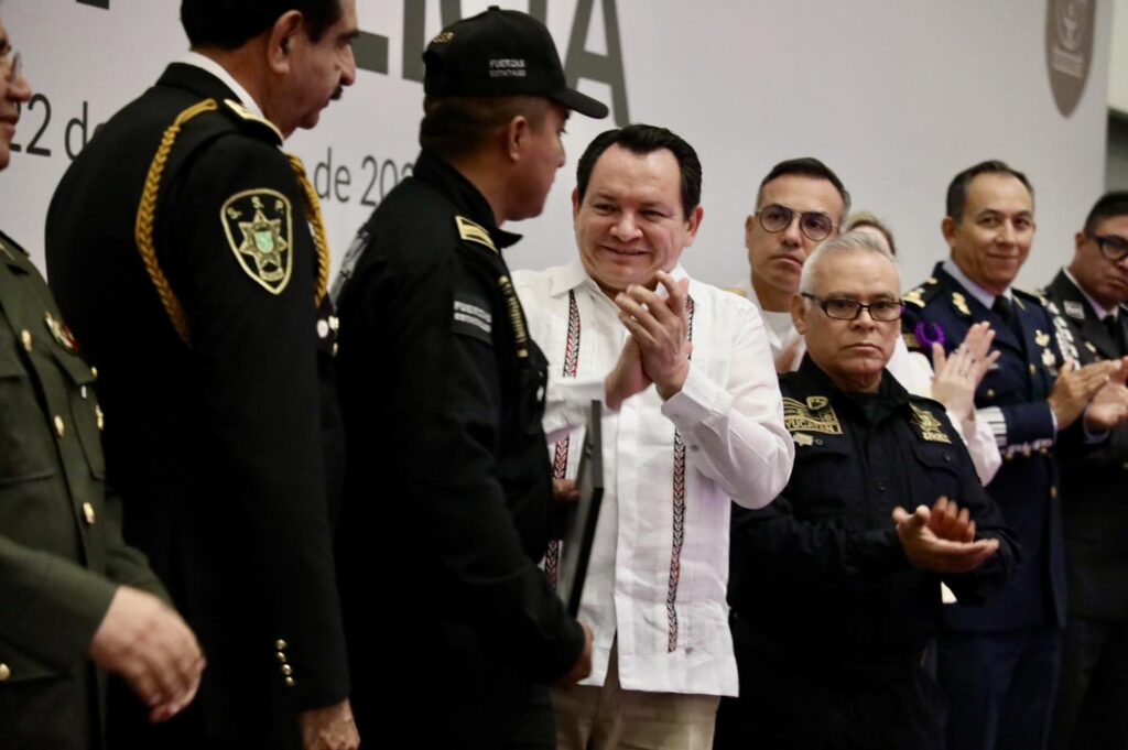 Acompañado del titular de la Secretaría de Seguridad Pública (SSP), Luis Felipe Saidén Ojeda, el gobernador entregó reconocimientos al Mérito Policial a 757 elementos, así como a 597 operativos y administrativos que cumplieron de 10 a 45 años de servicio dentro de la dependencia.