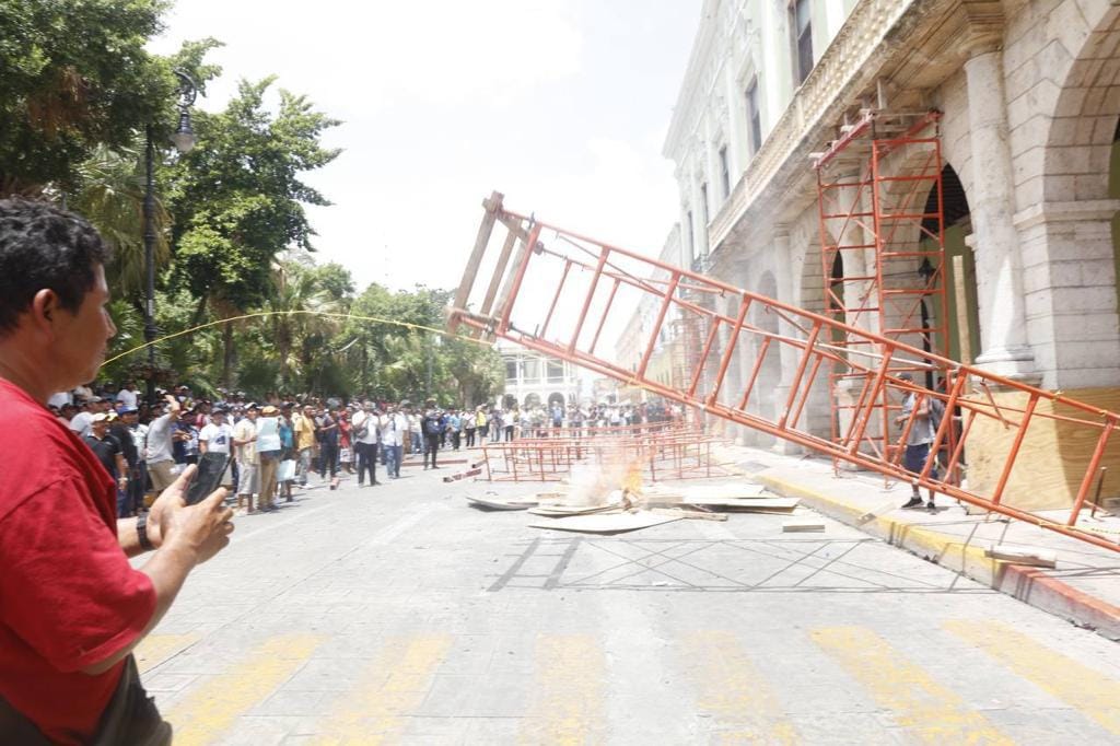 Mérida, Yucatán, 18 de agosto de 2023.- Actos vandálicos en contra de la infraestructura urbana del centro histórico de la capital yucateca fue el resultado de una protesta en contra del Gobierno Federal por la falta de un pago de indemnización por el barco que generó afectaciones en el Arrecife de Madagascar. Los violentos manifestantes son pescadores que se identificaron que provenían de Sisal, Hunucmá y Tetiz. Algunos de ellos, vociferaron groserías ante las personas que se encontraban en los alrededores, desarmaron y arrastraron las gradas portátiles que el Ayuntamiento de Mérida que coloca frente a la Catedral para los espectáculos nocturnos, dañando la calle y causando afectaciones a peatones y automovilistas que circulan por la zona. Aventaron bolsas, fierros y lo que encontraba a su paso para cerrar el tránsito del primer cuadro de la ciudad. Posteriormente, quitaron las tablas y los andamios que se encuentran en Palacio de Gobierno, los cuales están siendo usados para remozar el edificio, mismos que fueron aventados con violencia y luego les prendieron fuego, afectando a los comercios de la zona, así como intimidando a las personas que transitan por la plaza grande de Mérida. De acuerdo con las autoridades se pudo identificar la presencia de grupos de choque armados con piedras y palos para intentar generar hechos de violencia y provocación para acusar a las autoridades estatal de atentar contra las manifestaciones pacíficas.
