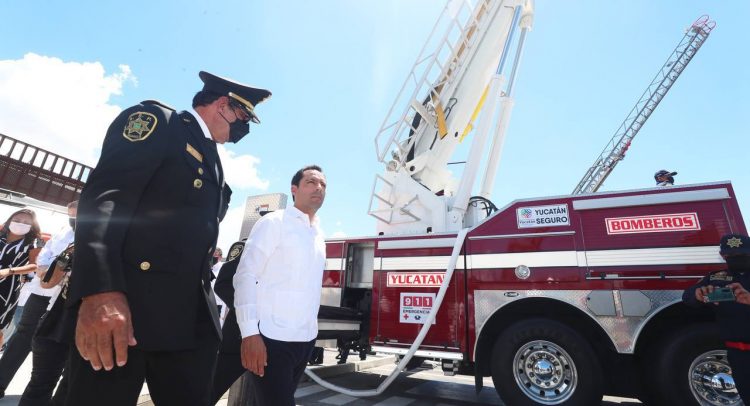 Se celebró el Día Internacional del Bombero ayer 22 de agosto, y en este marco el gobernador Mauricio Vila Dosal, como parte de la estrategia “Yucatán Seguro”, entregó casi 22 millones de pesos en equipo que incluye hasta un balde para transportar agua en helicóptero y cinco modernos vehículos contra incendios y de rescate que serán coordinados desde el Centro de Monitoreo C5i, uno de ellos con una escalera articulada de 30 metros y un cañón en la plataforma que puede alcanzar un tiro de agua de 120 metros y que es capaz de lanzar hasta 4 mil 700 litros de líquido por minuto.
